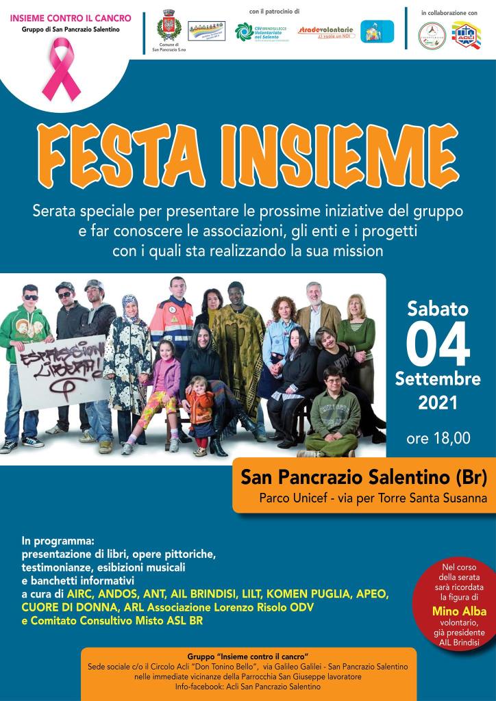 Lo scorso sabato 04.09.2021 L’associazione INSIEME CONTRO IL CANCRO ha organizzato l’evento “Festa Insieme” c/o il Parco Unicef a San Pancrazio Salentino (Br), con momenti informativi, testimonianze di volontari, medici ed associazioni che si occupano di malattie oncologiche, ricerca e prevenzione. Anche il comitato Andos di Brindisi ha partecipato insieme ad altre associazioni del territorio, AIL, AIRC, ANDOS, ANT, LILT, KOMEN PUGLIA, APEO, Cuore di Donna, ALR Lorenzo Risolo ODV e Comitato Consultivo Misto ASL BR.