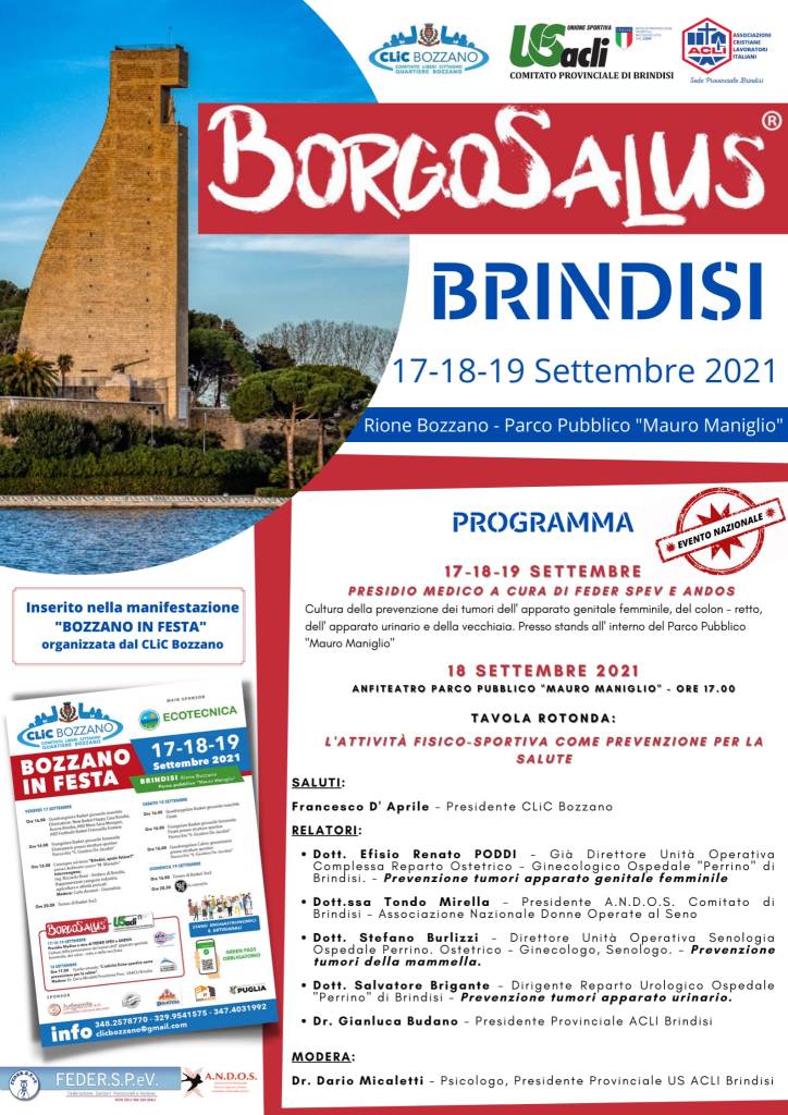Il 17-18-19 Settembre si è svolto il primo BORGOSALUS – Festival Nazionale di Educazione al Benessere promosso dall’ US ACLI. Un evento che si inserisce nella manifestazione “BOZZANO IN FESTA” organizzata dal CLiC – Comitato Liberi Cittadini – quartiere di Bozzano, presso il parco pubblico “Mauro Maniglio” a Brindisi.