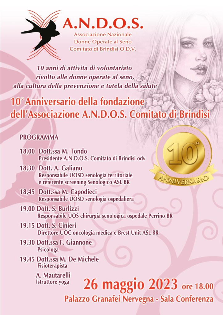 Venerdì 26 maggio si è svolto presso la sala conferenze del Palazzo Nervegna l’evento per festeggiare 10 anni di attività del comitato Andos Brindisi.