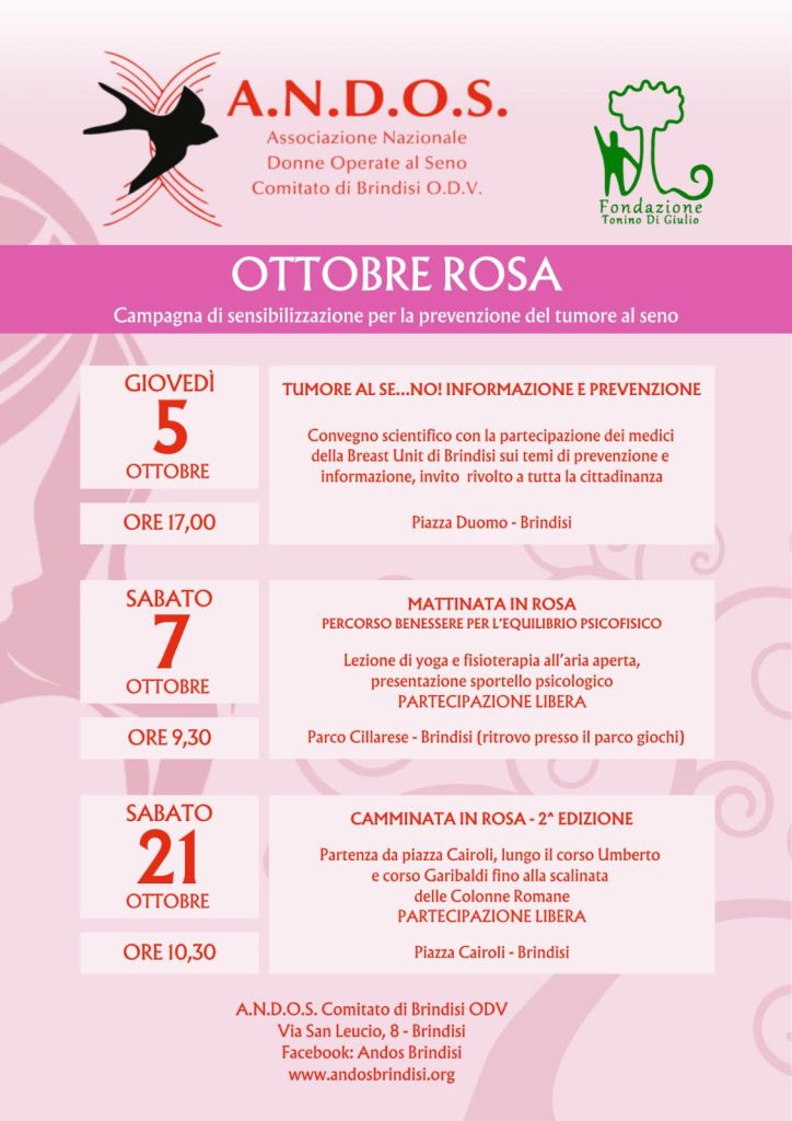 Stamattina, domenica 29 ottobre , nel parco Cillarese a Brindisi, si è svolta la “Camminata per la prevenzione – Cillarese in rosa”. Evento organizzato dall’Unità operativa di Oncologia medica del Perrino, in collaborazione con l’Ordine dei Farmacisti di Brindisi e con il patrocinio di Asl e Comune. Tra le associazioni che hanno supportato l’iniziativa erano presenti il comitato Andos , Cuore di donna, Le Civette del Salento, Komen Italia e Fondazione Di Giulio oltre alle associazioni dei farmacisti Agifar Brindisi e Farmacisti volontari della Protezione civile Puglia. Questa iniziativa rientra tra gli eventi organizzati per l’ottobre rosa per continuare a sensibilizzare le donne sull’importanza della prevenzione.